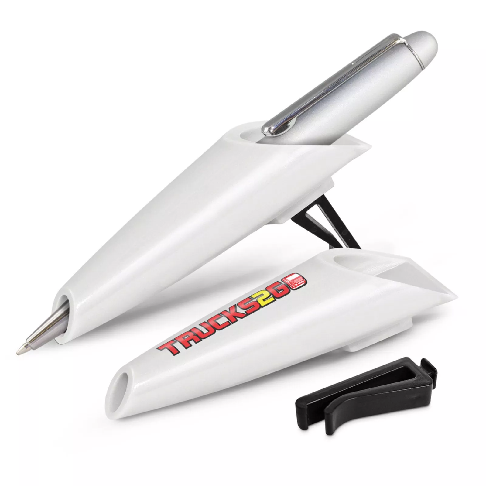 Buy promotional Hasken Car Pen Holders. The Hasken Car Pen Holder is the perfect way to keep your pens within reach while you’re driving. The holder clips securely to your car’s air vents and has a removable clip which is supplied unassembled, so you can customize it to your own needs. It’s also available in white, so it will match any car’s interior.
