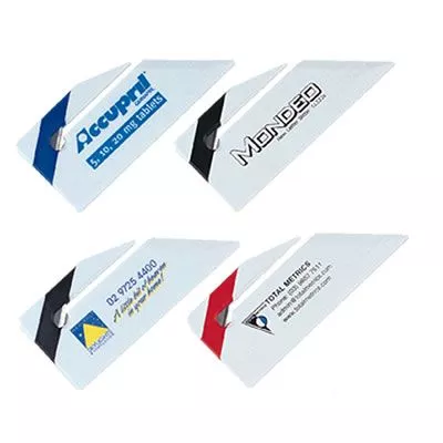 Features 45 degree set square. 10cm Ruler 1 side. 4 inch Ruler 2nd side and metal slitter. White case with choice of Red Black or Blue stripe ex stock. Multicolour prints available at extra cost. Price includes a 1 colour print. Set-up costs of $75 applies